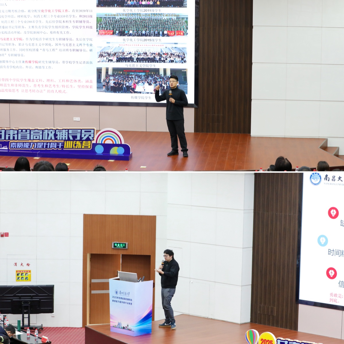 12月23日上午,刘国权与胡邦宁应邀作“赋能成长”专题报告。报告会上,刘国权结合自身深耕一线的育人实践,围绕新时代高校辅导员育人质效提升的策略与路径分享宝贵经验。他强调,辅导员要当好学生成长的深情陪伴者、人生规划的深度思考者、时代政策的深刻践行者,始终做到向上着眼明方向、向下扎根办实事、向内发力强本领。胡邦宁则聚焦科研思维培养这一核心议题,深入阐释了辅导员工作从“事务经验”向“学术成果”转化的内在逻辑,他指出,科研能力是辅导员专业化职业化发展的重要支撑,对青年辅导员而言尤为关键,广大辅导员需着力打通“眼关、心关、手关、人关”四道关口,努力成长为立德树人的师者、敢闯会创的学者、永不停息的思者、脚踏实地的行者。