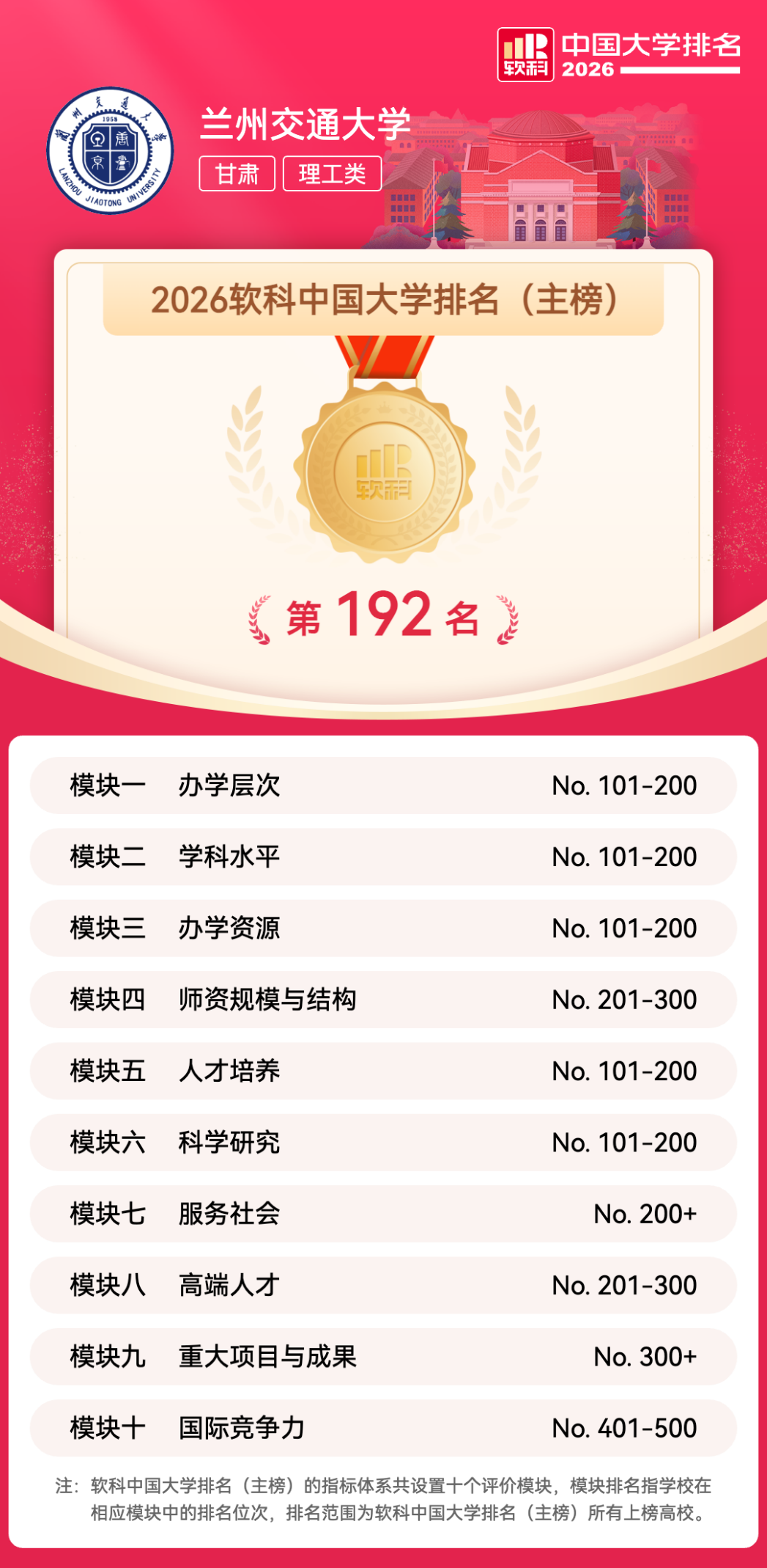 4月15日,全球领先的高等教育评价机构—软科发布“2026软科中国大学排名”,兰州交通大学位列第192位,跻身全国200强,比2025年提升了17位。