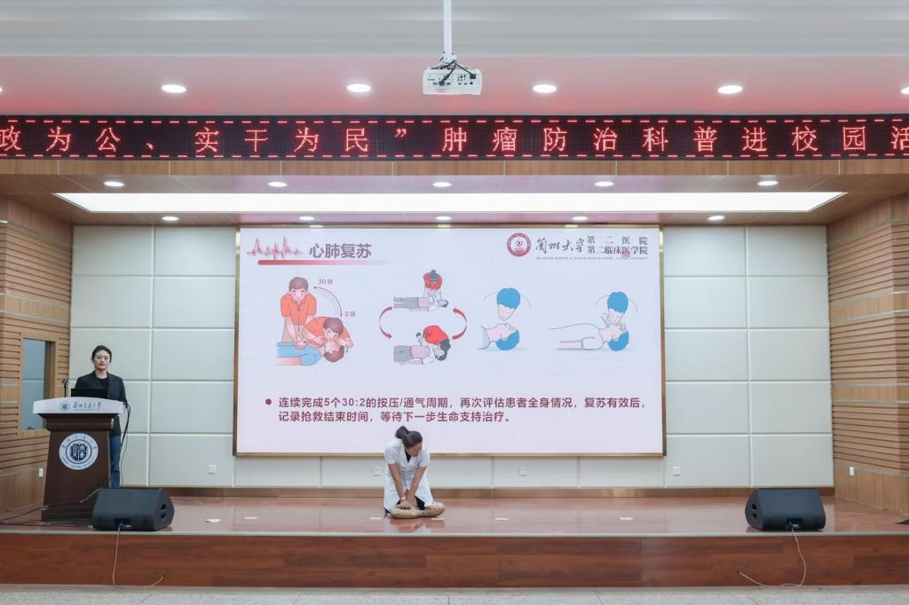 科普宣讲后,兰大二院肿瘤外科医护团队开展急救技能实操演练,现场演示心肺复苏标准流程,手把手指导师生掌握按压、通气等关键技巧,让大家学会关键时刻能救命的实用技能,切实提升自救互救能力。