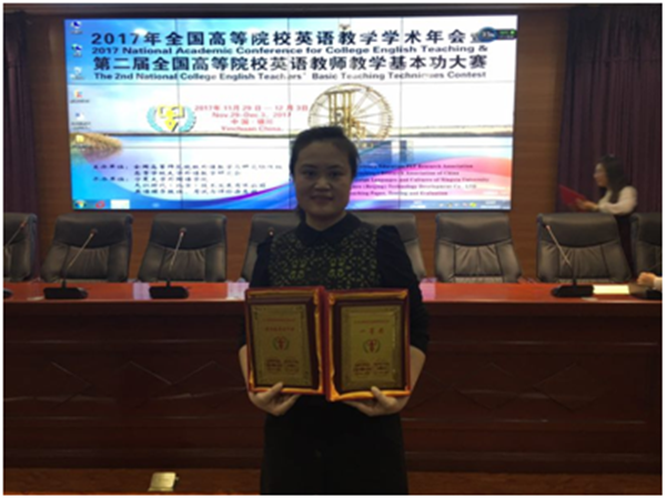 11月29日-12月2日,由高等学校大学外语教学研究会和全国高等师范院校外语教学与研究协作组联合举办的“2017年全国高等院校英语教学学术年会暨第二届全国高等院校英语教师教学基本功大赛”在宁夏大学举行。经过激烈角逐,马瑞老师荣获英语专业组一等奖和“最佳语音语调奖”;张蓓蓓老师荣获大学英语组一等奖和“最佳教学设计奖”。