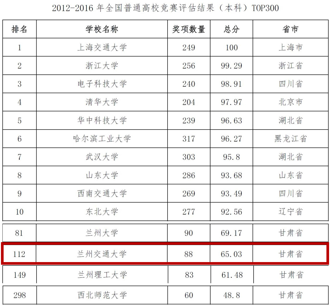 12月14日,中国高等教育学会《高校竞赛评估与管理体系研究》专家工作组按照本科、高职和省份分类,预发布《中国高校创新人才培养暨学科竞赛评估结果》。我校以88个奖项数量,总成绩65.03分,在2012-2016年全国普通高校竞赛评估结果本科组中全国排名第112位,在省内高校中排名第二,位列兰州大学之后。