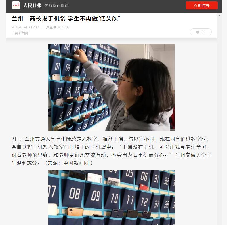 在上学期试行的基础上,本学期我校学生处在第一至第六教学楼的所有教室制作安装了手机存放袋,这一小小的“创举”不仅得到了广大师生的认可,还引起了社会的广泛关注。
