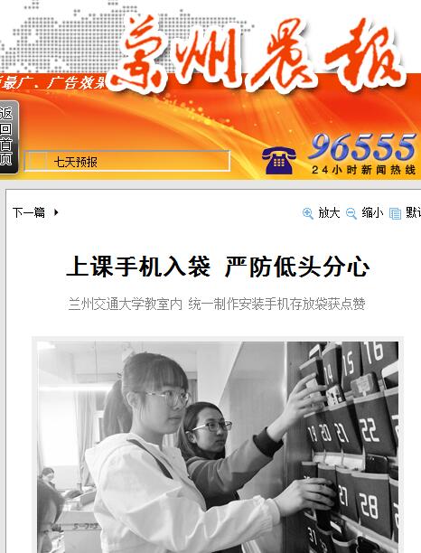 这一举措经学校官网、官方微信、今日头条号宣传报道,甘肃省教育厅官网转载后,引起了社会及众多媒体的广泛关注和好评。兰州晨报、中国新闻网、甘肃电视台等媒体先后来校实地采访,并分别以《上课手机入袋,严防低头分心——兰州交通大学教室内统一制作安装手机存放袋获点赞》《高校教室设手机袋让学生不“低头”》《教师悬挂手机袋 良好习惯靠自觉》等为题报道了此事。不仅如此,近日人民日报微信公众号、人民网、光明网、新浪新闻、网易新闻等众多网络媒体都进行了转载,广大网友也纷纷留言发表表示认可。