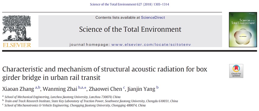 近日,我校机电工程学院教师张小安博士在其博士生导师翟婉明院士的精心指导下,以我校为第一单位发表的学术论文《Characteristic and mechanism of structural acoustic radiation for box girder bridge in urban rail transit》被SCI期刊Science of the Total Environment收录。该期刊影响因子4.900,5年影响因子5.102;属于中科院分区2区。在工程类学术论文中具有较高的影响因子。