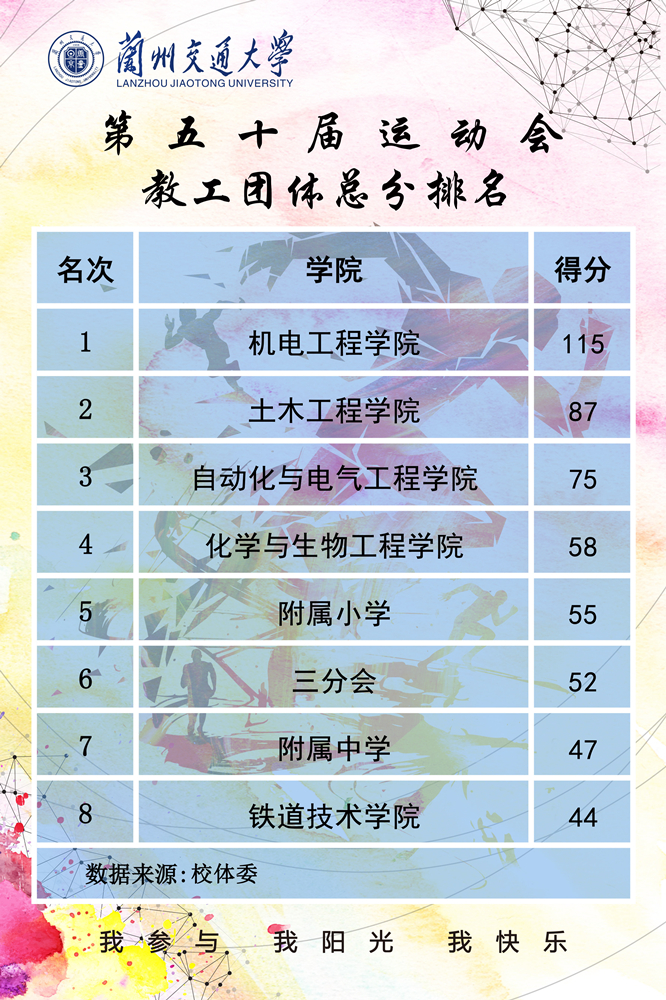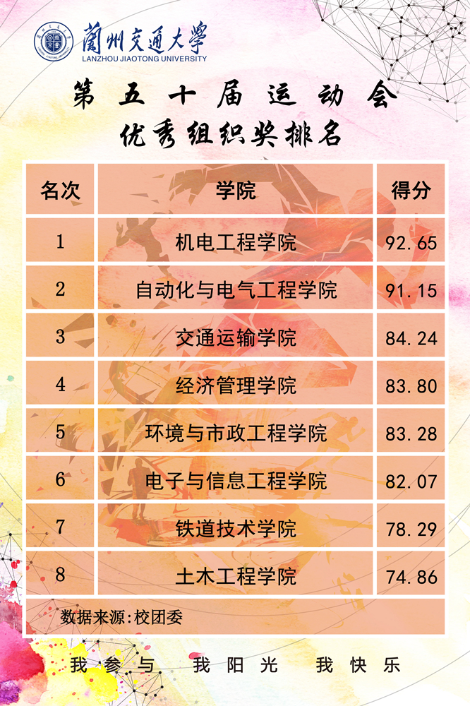 5月18日下午,随着大学生10*200米混合扛旗接力和大学生拔河比赛的结束,历时三天的兰州交通大学第五十届校运会圆满落下了帷幕。