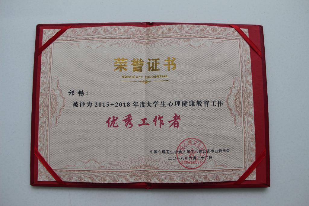 近期,中国心理卫生协会大学生心理咨询专业委员会在“第十三届全国大学生心理健康教育与咨询学术交流会”上评选和表彰了一批优秀集体和先进个人,我校学生工作(部)处大学生心理健康教育服务中心荣获2015-2018年度大学生心理健康教育工作“先进集体”称号,中心专职心理咨询教师祁畅荣获“优秀工作者”称号。