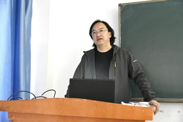 讲堂开始,首先由党震先生做了题为“绘画语言与情感、境界的关系——形式语言规律”的讲座,他向大家讲述了绘画形式语言规律,并从形式语言的范畴、情境的经营、色彩与空间、对比与协调四个方面做了详细的介绍,通过对当代水墨与西方抽象油画的类比分析,更加直观的让同学们理解绘画创作中形式语言的组织运用。