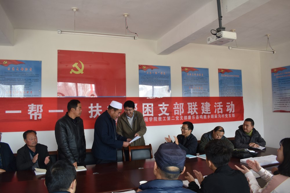 2018年10月25日,土木工程学院教工第二党支部赴康乐县鸣鹿乡胡麻沟村开展“一对一、一帮一扶贫帮困支部联建”帮扶活动,鸣鹿乡及胡麻沟村相关负责人参加了支部联建活动。