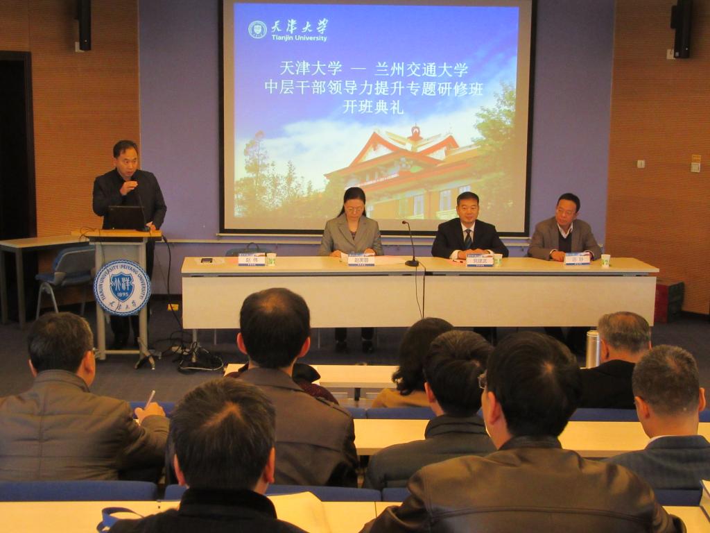在19日上午举行的开班仪式上,天津大学党委常委、党委组织部部长赵美蓉教授简要介绍了天津大学的历史和传统,对我校干部在天津大学培训表示欢迎。我校党委常委、副校长党建武教授在开班仪式上致辞,简要回顾了天津大学对口支援兰州交通大学的工作情况,对参加培训的领导干部提出三点要求:转变观念,进一步提高对教育培训工作的思想认识;勤学善思,进一步增加谋事干事成事的能力;遵规守纪,进一步发挥模范带头作用。