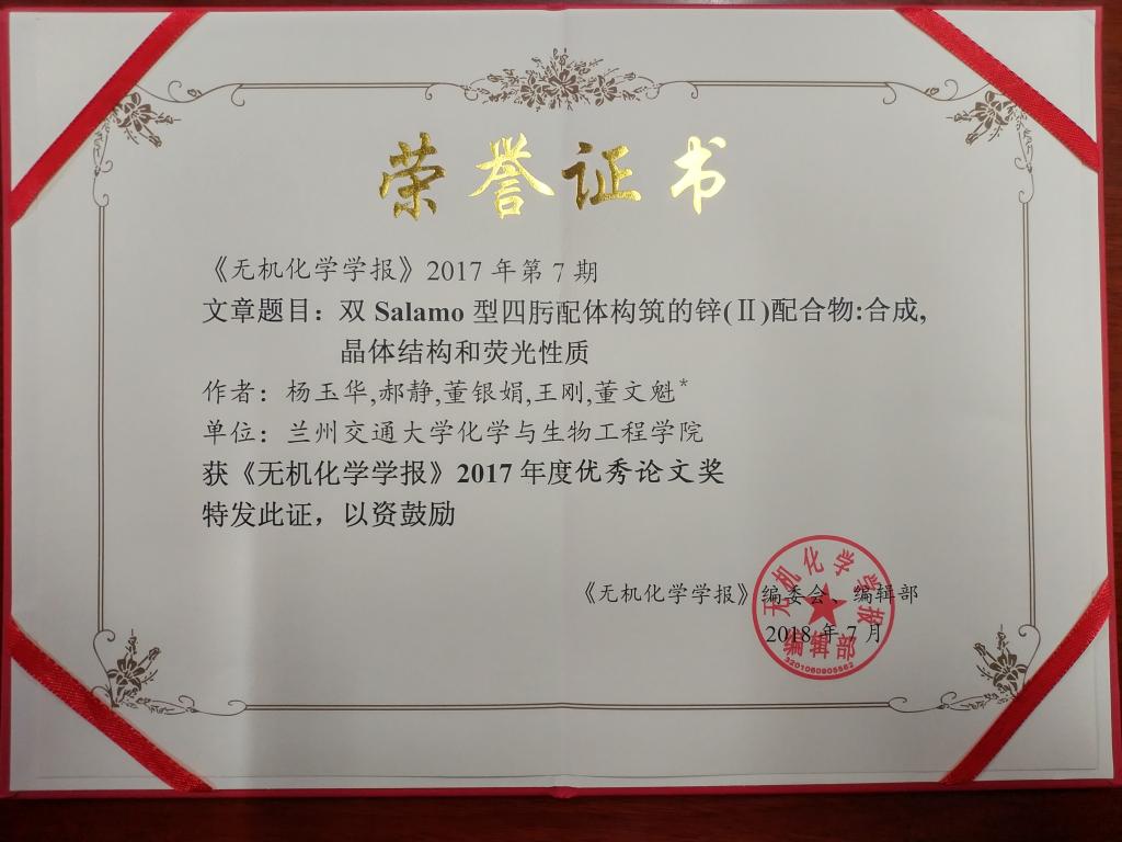 继“化学”学科进入ESI全球排名前1%后,近日我校化学与生物工程学院又传捷报,该院董文魁教授和孙银霞教授为通讯作者的共5篇SCI论文分别被《无机化学学报》和《中国化学快报》评为“优秀论文”和“高影响力论文”。
