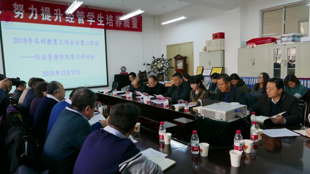 12月17日下午,经济管理学院召开了2018年本科教育工作学习研讨会。副校长高云庆,教务处等相关职能部门主要负责人、经管学院全体班子成员、学院督导、各办公室主任、各系主任、教师代表共45人参加了会议。高云庆副校长主持会议并讲话。
