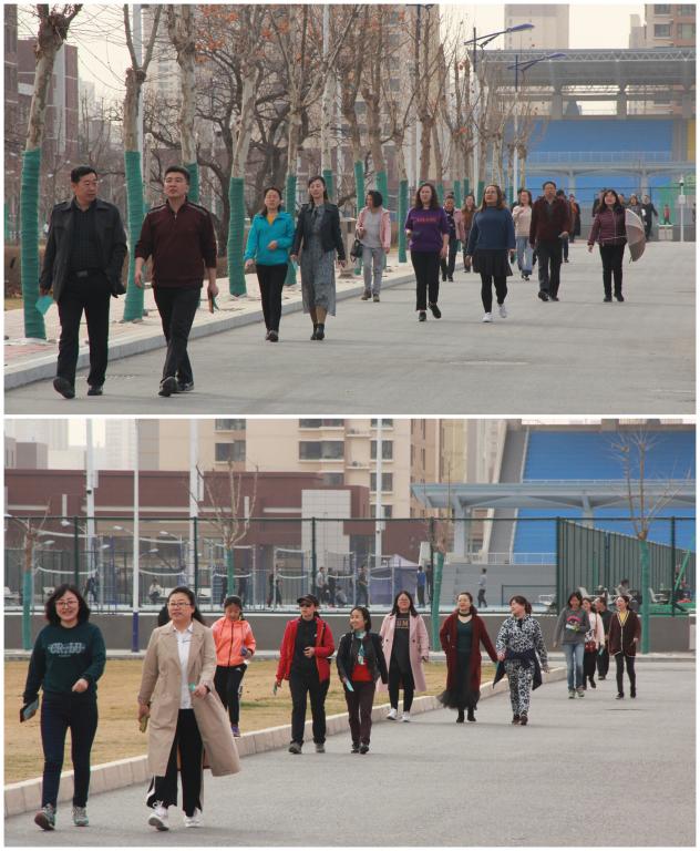 健步走路线途经学府路、北校区西大门、和谐园、第九教学楼和天佑园,全程约4公里。活动周期间,每天下午四点十分到六点,老师们精神饱满、热情高涨、边走边交流,感受着健步走带来的欢乐。