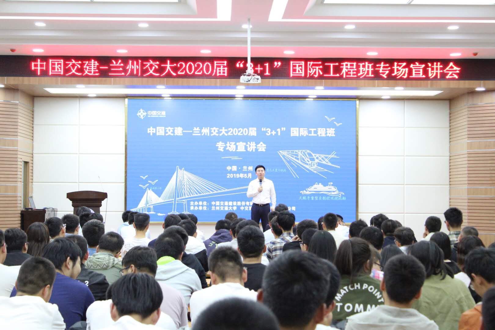 5月26日晚,中国交通建设股份有限公司—兰州交通大学第三届“3+1”国际工程班联合培养宣讲会在我校二教报告厅举行。副校长马军党、中国交通建设股份有限公司人力资源部人事处处长王涛出席,中国交建旗下13个子公司招聘代表、学校招生就业处、相关学院负责人及300余名2020届毕业生参加了宣讲会。