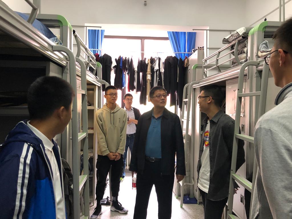 就餐后,范爱国来到校内22号公寓男生宿舍,仔细查看询问公寓学生服务站设备使用情况,了解同学们的住宿环境与日常生活情况。范爱国叮嘱同学们要多与舍友沟通,珍惜同窗情谊,努力营造安全、和谐的宿舍环境。他希望学生们能够不负青春,志存高远,脚踏实地向理想不断迈进。