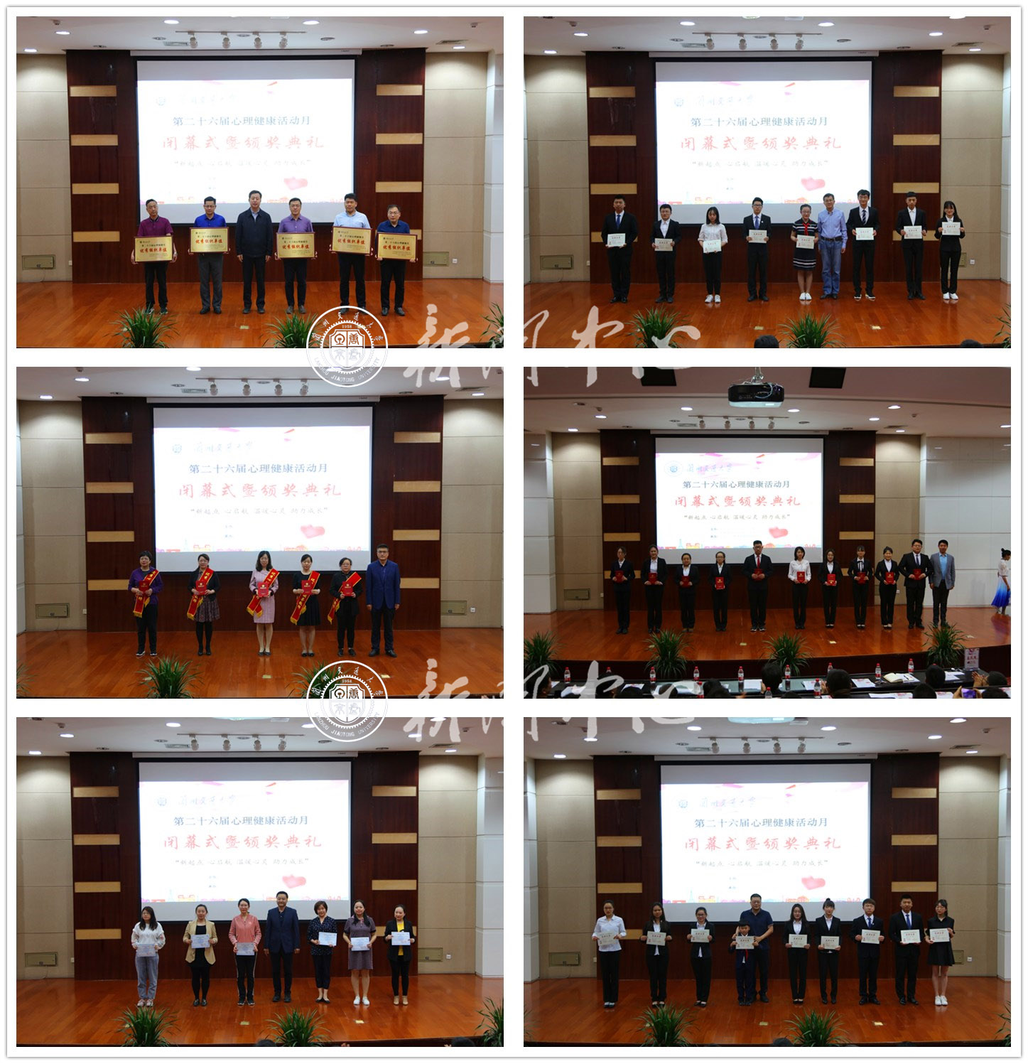 在表彰环节中,参加本届心理健康活动月“心新IDEA”心理微视频创作大赛、“耀动青春”心理短片配音创作大赛、“暖心圈子”创意图文征集比赛、“心若向阳”校园心理情景剧大赛、“抒诵年华”温暖心灵朗读大赛、“心言手语”心理手语操比赛的同学们现场献上了精彩纷呈的情景剧、手语舞等节目,期间,相关部门领导分别为兰州交通大学优秀心理委员颁奖、兰州交通大学十佳心理委员、兰州交通大学优秀心理辅导教师颁发了获奖证书,为本年度外出参训并获得认知行为分析师、绘画分析员、绘画分析师的心理教师颁发了资格证书。