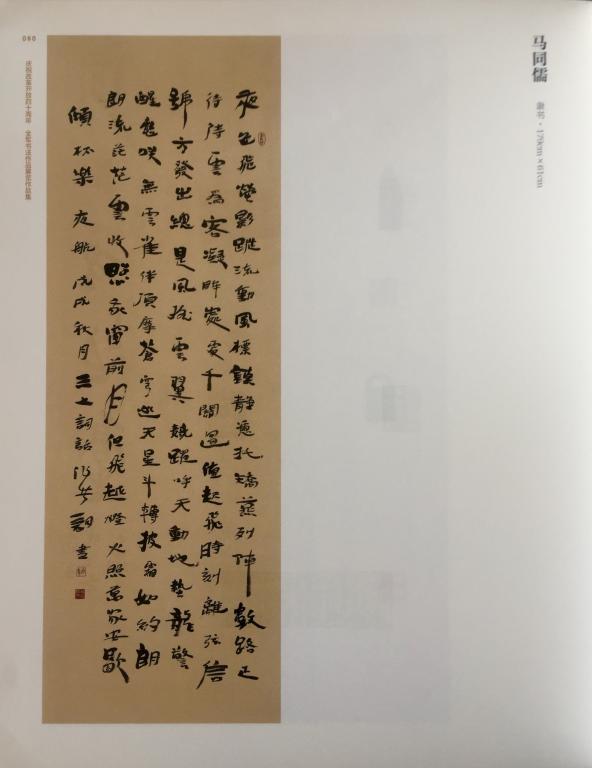 此次书展旨在引导人民群众和广大官兵感悟变革、铭记历史、坚定信心、开创未来。作品征集面向全军和武警部队官兵,离退休人员和退役军人。展览在解放军八一美术馆隆重展出,此次展览,全国共307名作者入展,其中有享誉全国的书法名家,也有基层书法爱好者。马同儒的参展书法作品内容系他的词学专著《三上词话·词谱》卷中《倾杯乐·夜航》一阕,运用汉简的笔意,兼具行楷书的特点,较好的表现出了书作整体平正与奇险完美的结合,其传达的情怀跃然纸上。