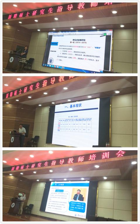 学科与学委办主任何瑞春教授作了《学校学科学位建设与发展》的报告,就学校学科学位建设历史、现状和发展方向进行了介绍。田铭兴教授作了《立足现状,勤奋工作,努力当个“好”导师》的报告,结合自己多年指导经验,从对生源现状分析、具体指导方法等方面,以生动的事例作了深入浅出的经验交流。研究生院各科室负责人从研究生招生、培养、研究生管理、奖助以及论文审核等实际工作中所涉及到的各项工作内容、具体要求、政策依据等做了详细讲解说明。