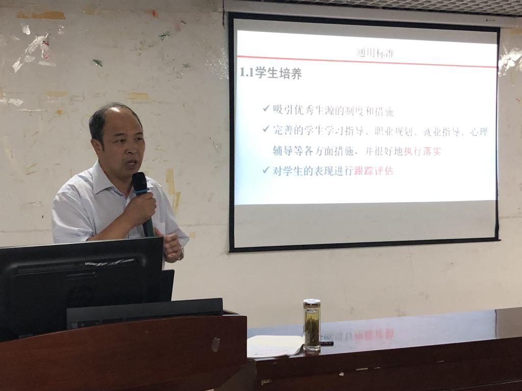 张国珍作为专业负责人首先做了题为《给排水科学与工程专业标准解读》的报告。他在报告中重点介绍了《普通高等学校本科专业类教学质量国家标准》中关于专业培养目标和课程体系建设的相关要求,涵盖了学生培养、毕业要求、课程体系设置、师资队伍、支持条件等几个方面的内容,并就教育部教指委副主任委员的评估认证经验结合相关高校案例,对优质生源引入、学生入学教育、学生国际视野培养、解决复杂问题能力培养、沟通能力培养、创新创业实施以及青年教师能力提升、特色课程体系设置和金课打造等谈了自己的观点看法和具体的措施建议。他强调,专业建设的责任主体是系主任、教研室主任,专业建设更离不开每一位教师,大家应该多出去学习、多去调研、多去开会,一方面学习经验、改进自我,一方面还能够宣传专业、宣传学校,这一点十分重要。