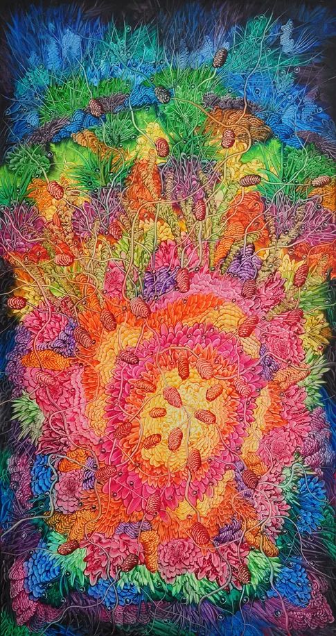此次展览的策展人欧阳毛毛认为,蓝充是一位纯粹的艺术家,他一直在探索、变化与成长。“我们从他的作品中可以感知到他的精神世界以及对艺术孜孜不倦的追求。从山城、公鸡再到繁花,透过这十年他所创作一系列作品,从色彩,从意境,从格调方面,我们可以看到一位越来越自信的艺术家的自我成长的轨迹。”