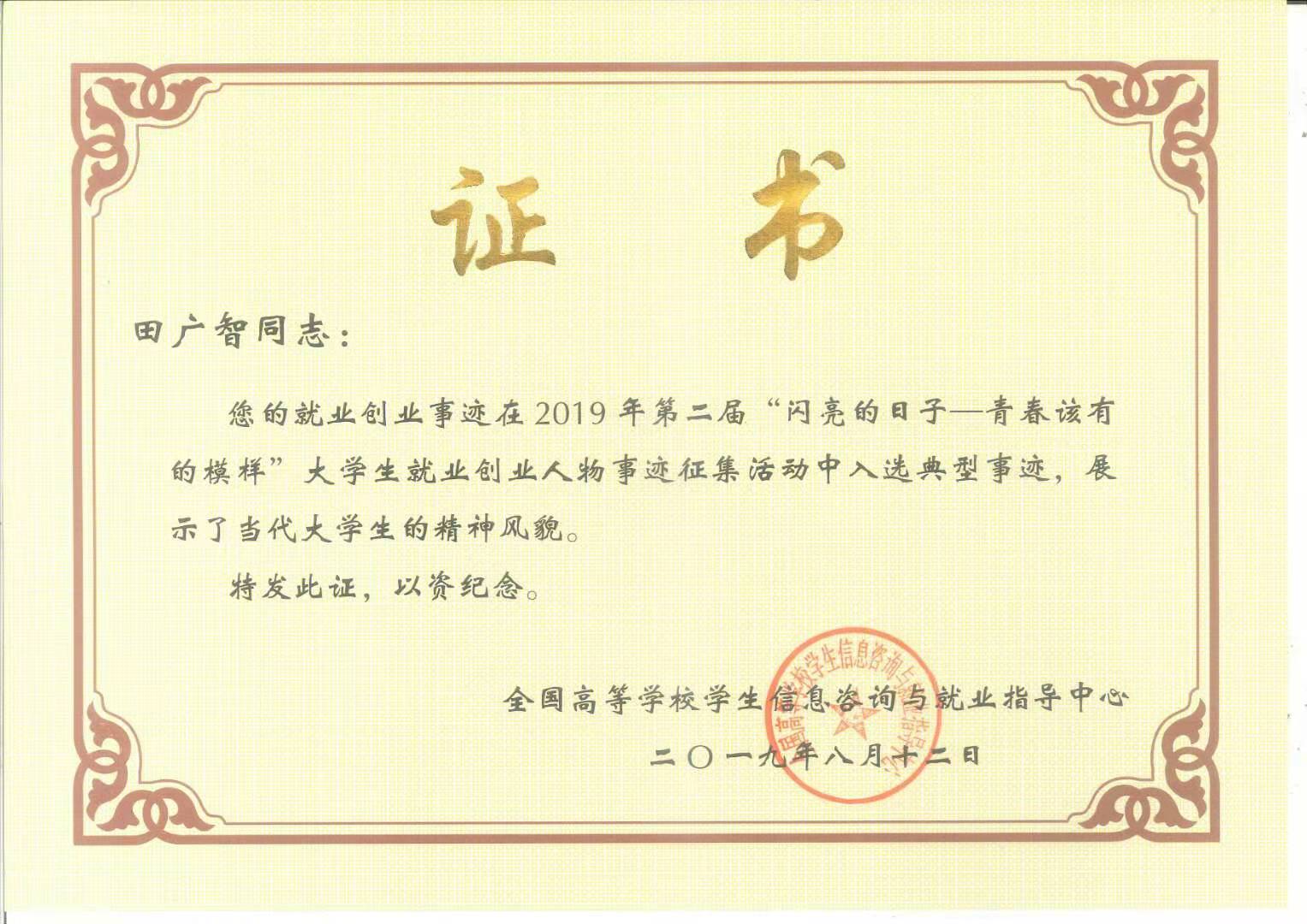 为贯彻2019届全国普通高校毕业生就业创业工作网络视频会议精神,书写中国高等教育“奋进之笔”,响应习近平总书记和李克强总理鼓励大学生基层就业和创新创业的号召,加强高校毕业生就业创业宣传,全国高等学校学生信息咨询与就业指导中心组织展开了第二届“闪亮的日子——青春该有的模样”大学生就业创业人物事迹征集活动。