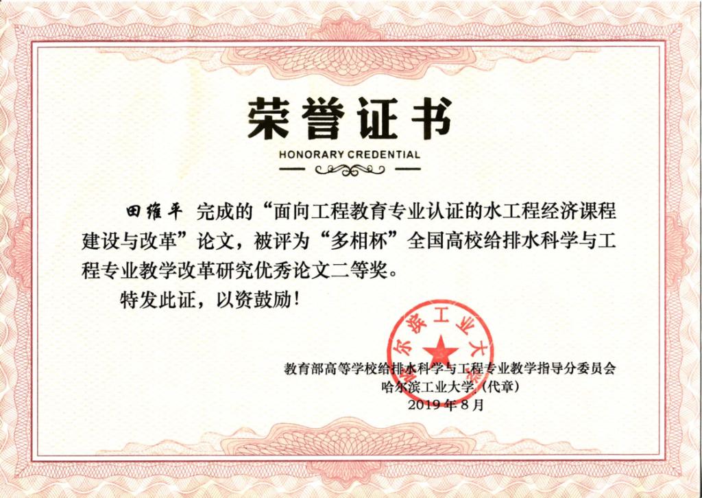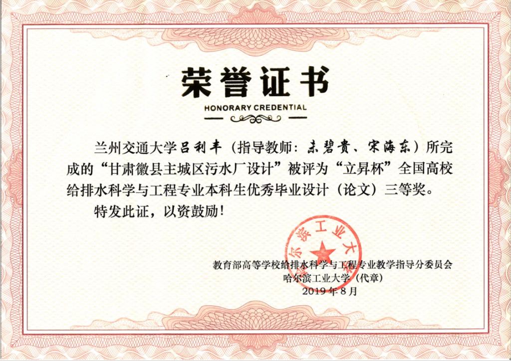 最终,我校师生取得了1项二等奖和1项三等奖的优异成绩。由环境学院建筑给排水与施工教研室田维平老师完成的“面向工程教育专业认证的水工程经济课程建设与改革”论文,被评为全国高校给排水科学与工程专业教学改革研究优秀论文二等奖;由环境学院给排水科学与工程专业2015级学生吕利丰同学所完成的“甘肃徽县主城区污水厂设计”被评为全国高校给排水科学与工程专业本科生优秀毕业设计(论文)三等奖,该设计由学院未碧贵教授和中国市政工程西北设计研究院有限公司宋海东高工共同指导,也是环境学院试行本科毕业设计校企“双导师制”以来取得的初步成果和成效。
