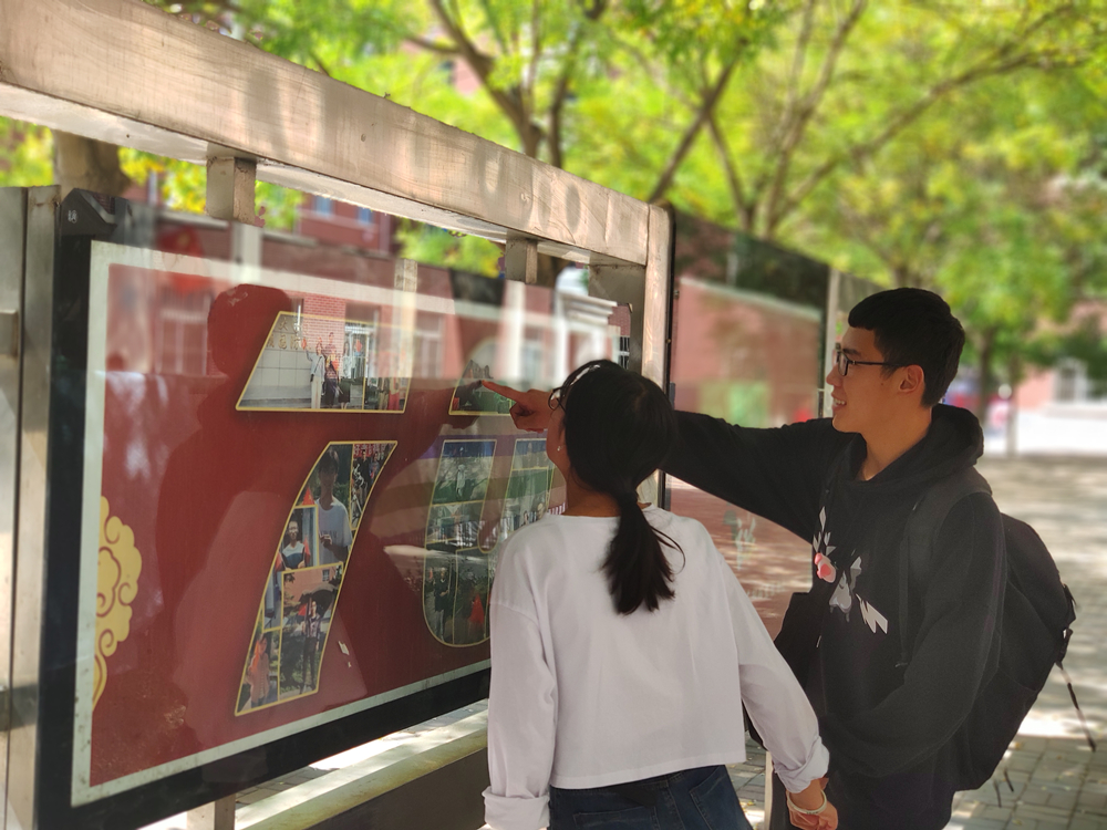 环境学院建环1802班宋健凯同学说:“走进学生公寓,红旗赳赳飘扬,灯笼红彩熠熠,展板满载贺意,满满的国庆氛围。展板展出时,我和宿舍的小伙伴们第一时间跑出来寻找展板上的自己”。