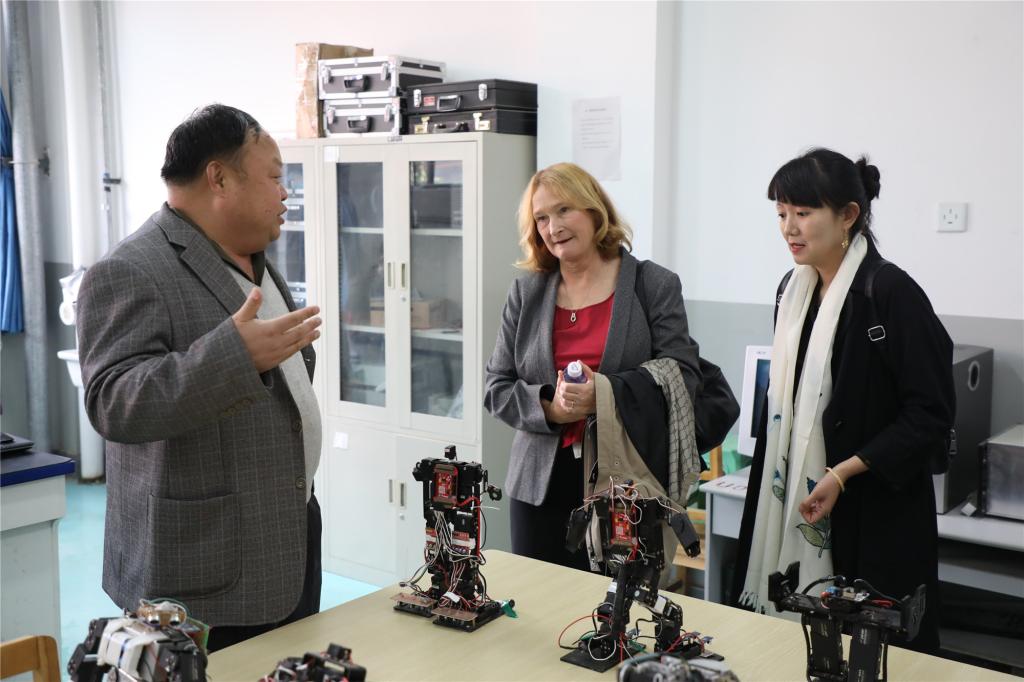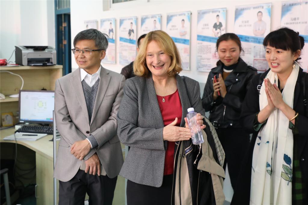 座谈会结束后,美国明尼苏达大学代表团一行在国际交流处相关负责人的陪同下,参观了大学生创新创业基地和外教公寓。Mary Holz-Clause校长对我校学生的创新能力和取得的成就大加赞赏,她鼓励同学们继续努力,设计出更多集创新性、艺术性和安全性于一体的优秀作品。