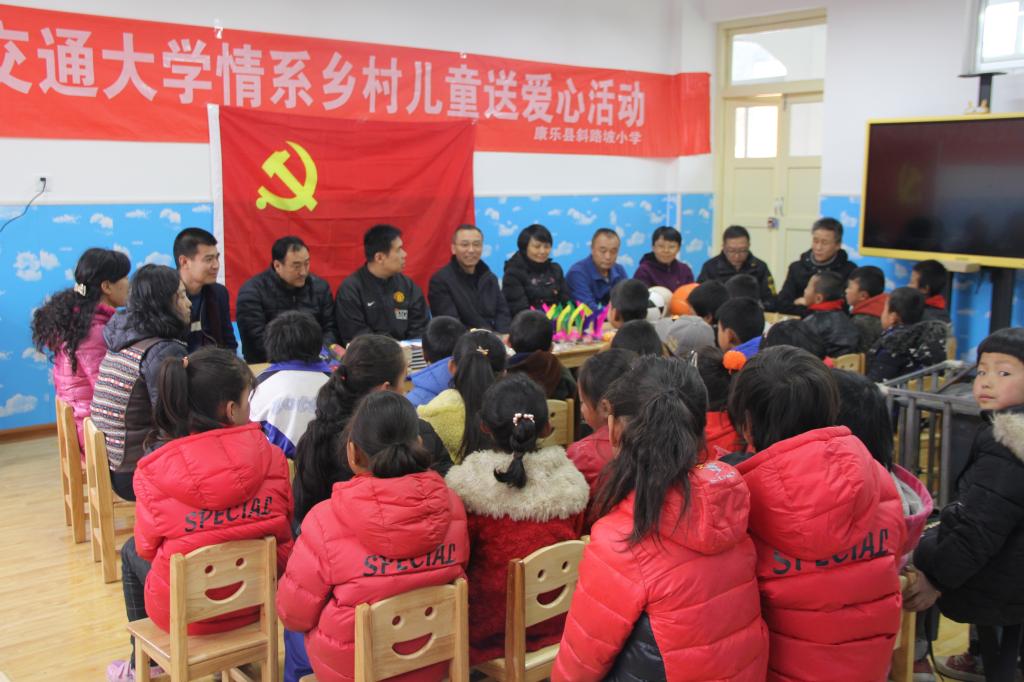 座谈会后,与会人员共同前往斜路坡村小学,与学校老师、小学生进行了交流。斜路坡村小学分幼儿园和小学两部分,幼儿园有39名孩子,小学设一至三年级,每级一个班,共38名学生。校工会负责人代表工会党支部向该校师生捐赠了笔记本、稿纸、篮球、排球、足球、羽毛球、乒乓球、跳绳等文体用品,并鼓励学生们要勤奋读书、强健体魄,用知识改变自己的命运和家乡的面貌。