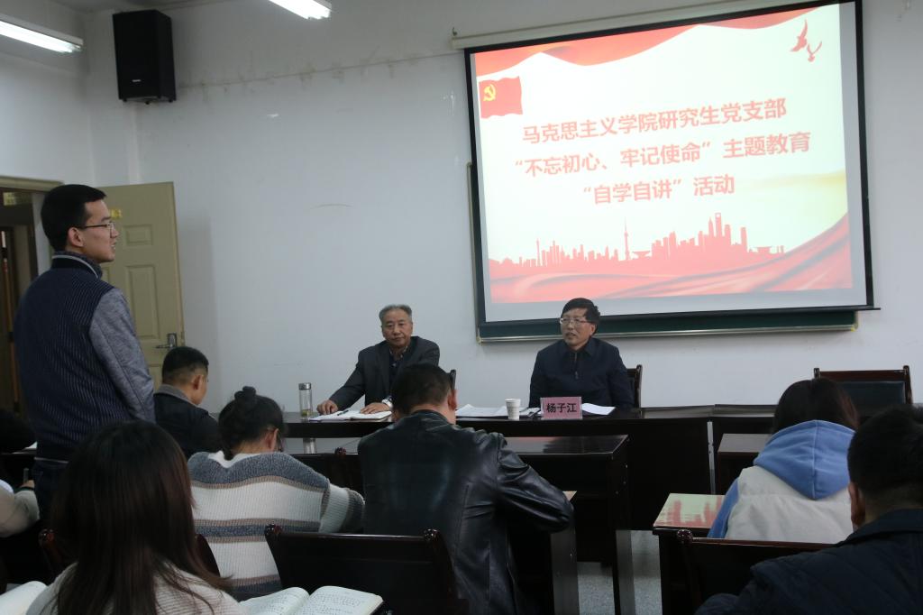 11月18日,校党委书记杨子江来到马克思主义学院,参加马克思主义学院研究生党支部“不忘初心、牢记使命”主题教育“自学自讲”活动。党(校)办、马克思主义学院相关负责人,全体研究生党员参加了活动。