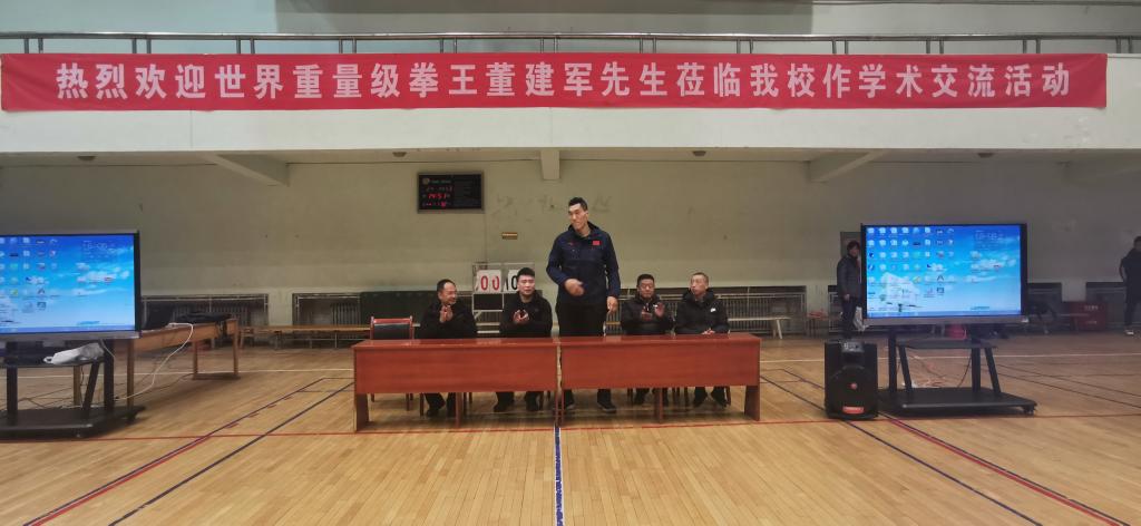 11月26日下午,学校体育部邀请世界重量级拳王董建军先生(号泰山)在体育馆为500多名师生做了一场题为“弘扬爱国情怀,为理想而奋斗”的拳击运动讲座。