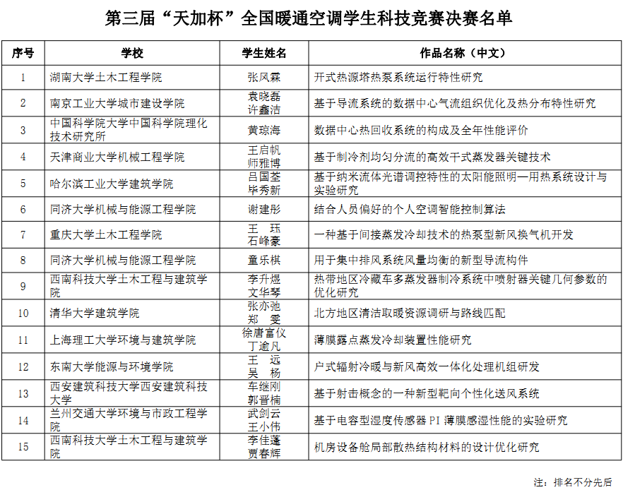 2019年第三届“天加杯”全国暖通空调学生科技竞赛初赛共有来自清华、天大、哈工大等35所院校的46个作品,分三个赛区进行角逐。大赛旨在鼓励和提升我国建筑环境与能源应用专业学生参与国际赛事的水平和能力,在校及毕业1年以内的本科生和硕士研究生均可参赛,参赛作品及答辩语言采用全英文,第一名将代表中国参加世界暖通行业大学生科技竞赛。