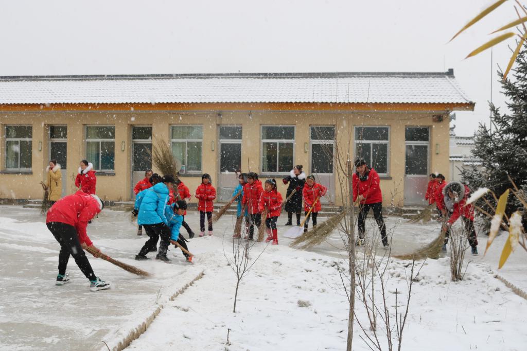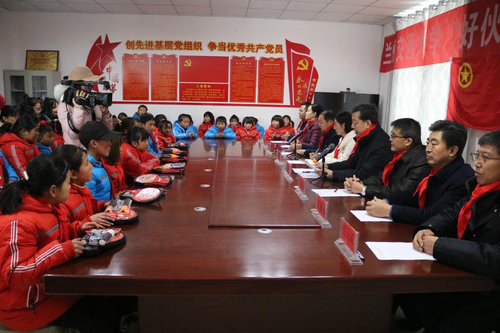仪式中,小学生们为与会嘉宾系上了红领巾,嘉宾们为拔子沟小学赠送了文体用品。志愿者与留守儿童不畏严寒一起扫雪,并在教室中进行了丰富多彩且温馨的陪伴活动。