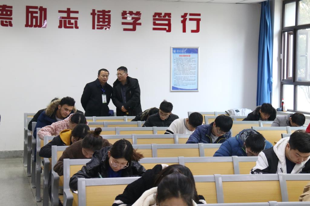 12月30日下午,副校长刘振奎深入期末结课考试现场巡视检查。刘振奎仔细检查了考场考试纪律、监考教师履职、试卷命题及学生答卷、教学楼设施及卫生环境等情况。从考场检查情况来看,学生遵守考试制度,监考老师认真履行职责,考场秩序井然,教学楼设施运转正常,环境卫生等情况良好。刘振奎对考试组织安排、考场秩序及考试巡视工作给予了充分肯定。