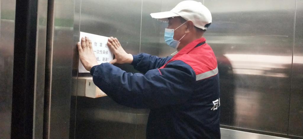 动力服务中心从1月31日起,对校内运行的9部电梯每日进行两次日常消毒处理,建立了消毒人员微信群,通过上传消毒作业照片的方式,向电梯管理人员报告消毒持续时间、消毒方式,由电梯管理人员对每部电梯做消毒记录台账。还在每部电梯连续放置一次性抽纸和回收废纸垃圾桶。截至目前,电梯消毒324次、放置抽纸180包、张贴“疫情期间乘坐电梯注意事项”宣传海报25处。