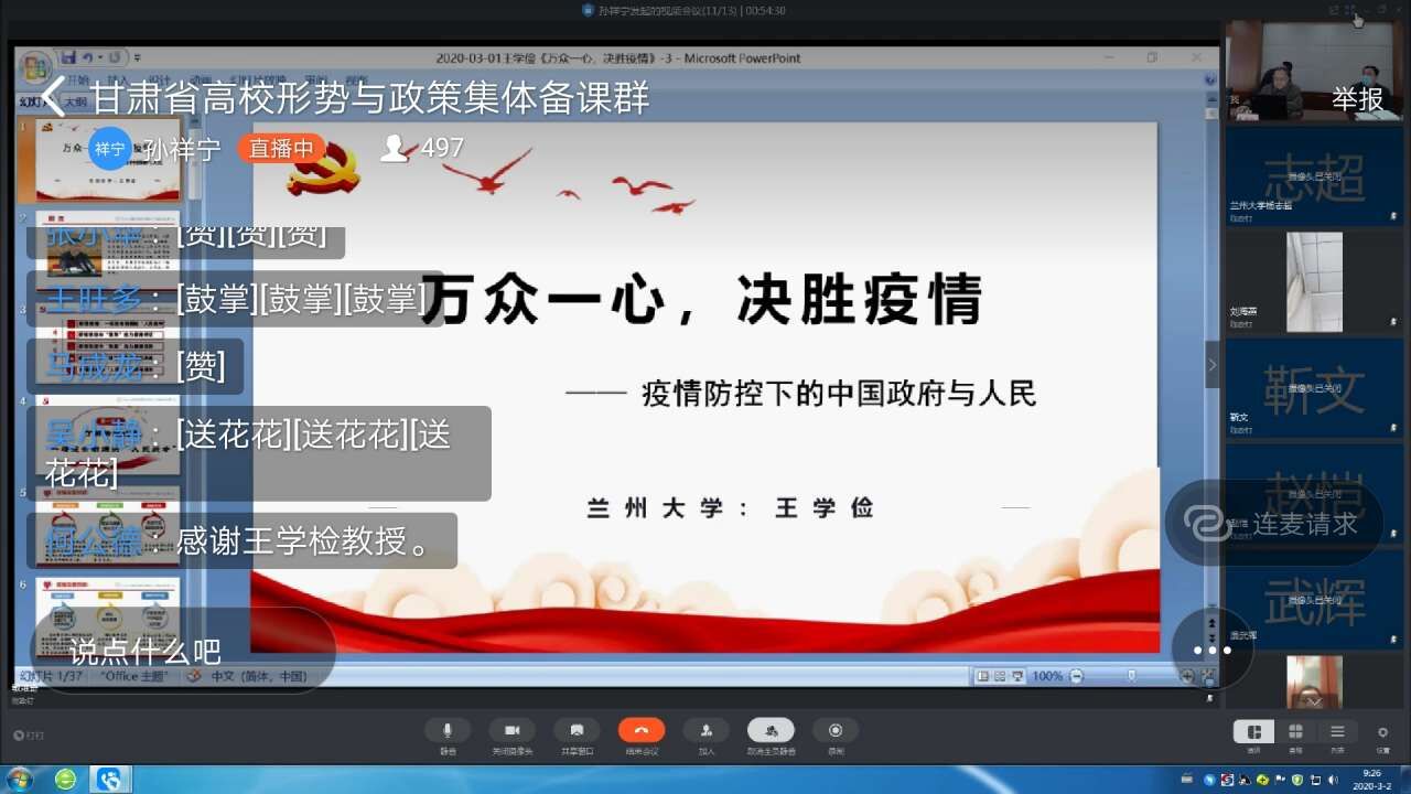 本次集体备课会的主题是“众志成城 共克时艰”,甘肃省委教育工委专职副书记张晓东作了动员讲话,要求各高校要积极挖掘本次疫情防控战中更多的育人元素、讲好身边的感人故事、传递好“众志成城、共克时艰”的中国精神,为做好疫情防控期间的思政课做好准备工作。兰州大学马克思主义学院王学俭教授作了《万众一心 决胜疫情——疫情防控下的中国政府与人民》辅导报告,兰州大学、甘肃中医药大学、甘肃医学院、兰州石化职业技术学院作了会议交流发言。