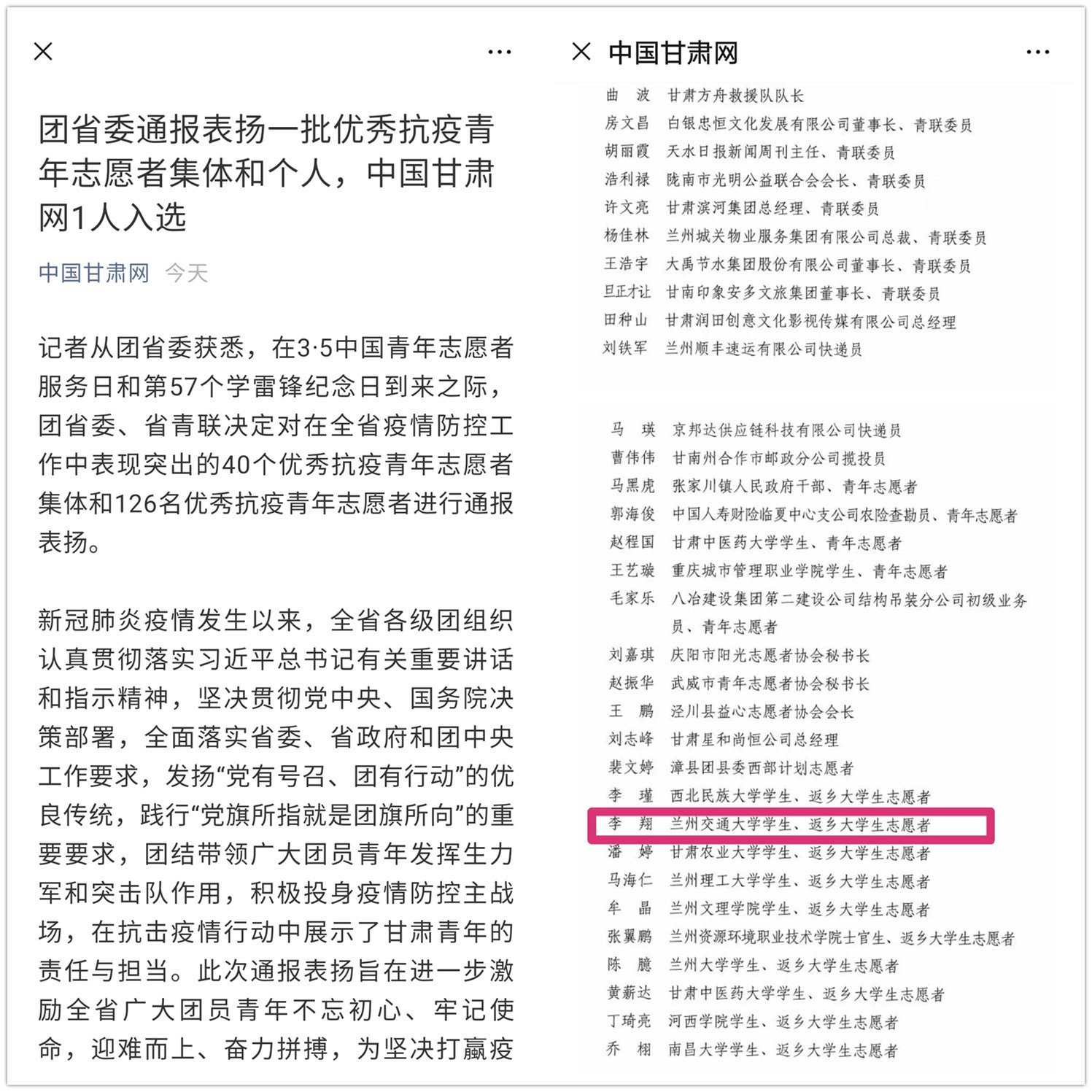 2020年3月,李翔被共青团甘肃省委、省青联授予“甘肃省优秀抗疫青年志愿者个人”荣誉称号,这份荣誉他当之无愧。