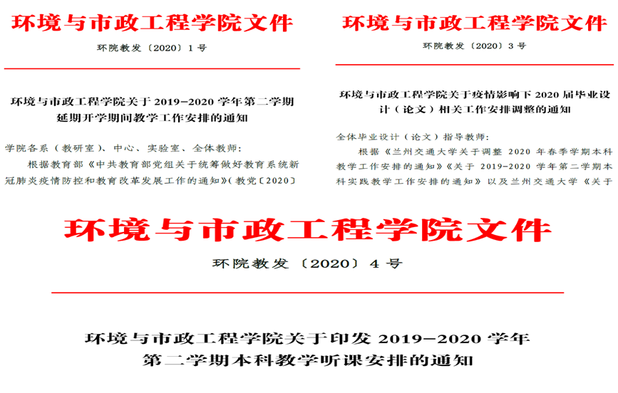 环境学院根据学校《兰州交通大学关于调整2020年春季学期本科教学工作安排的通知》等文件要求,结合教育部、甘肃省教育厅以及学校党委针对疫情期间延期开学的总体精神,及时召开了党政联席视频工作会议,重点研究部署了学院的线上教学工作,建立了思路清晰、任务明确、确实可行的线上教学工作实施方案并有效实行。
