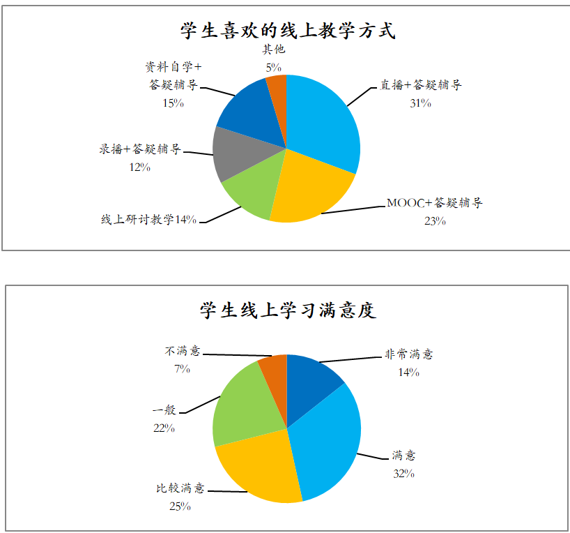 从调研问卷结果来看,我校师生已基本适应线上教学方式,教与学的理念不断提升转变;学生基本认可和接受在线学习方式,教师的教学设计也根据线上教学特点进行了重构,为将来积极推进混合式教学改革、提高课程教学质量、有序推进各项教学工作奠定了重要基础。