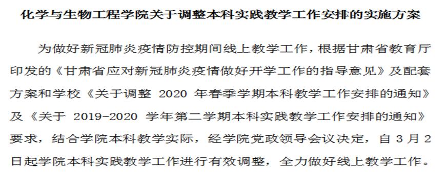 化工学院根据《兰州交通大学关于调整2020年春季学期本科教学工作安排的通知》和《化工学院关于调整2020年春季学期本科教学工作安排的通知》等文件精神,有序推进线上教学工作。