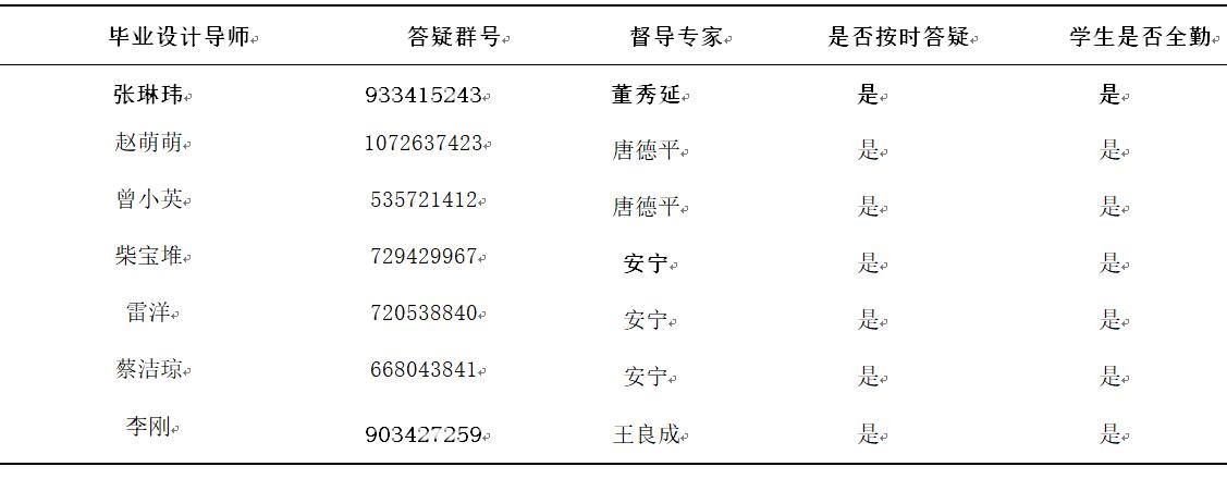 二是本科实践教学领导小组成员进入毕业设计(论文)答疑指导群检查答疑情况,并于每周五前将毕业设计答疑情况汇总反馈至学院教务办公室。