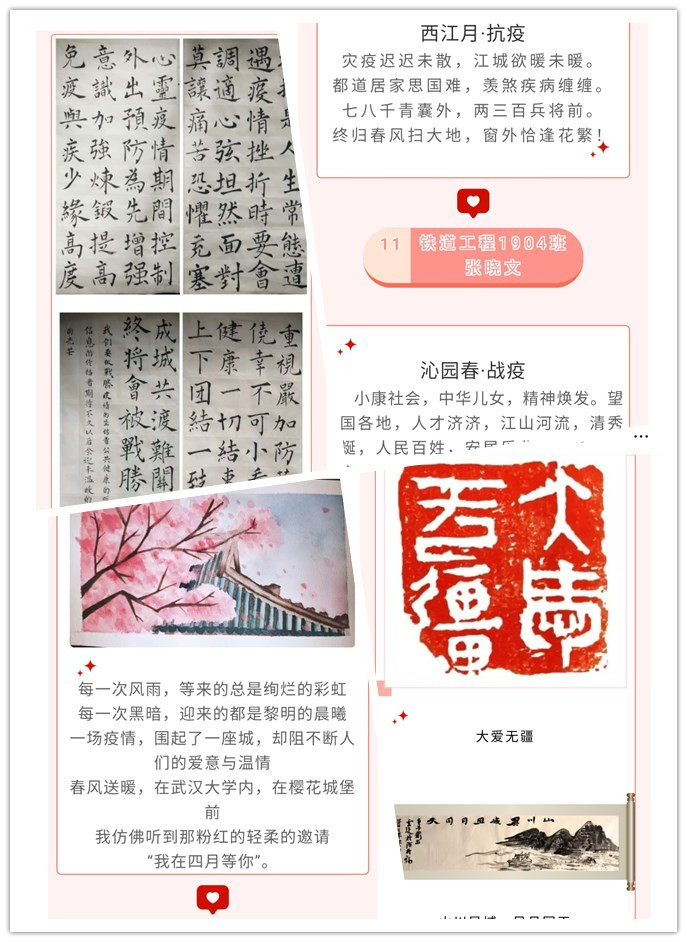 疫情发生后,学院开展了“国有疫情,我有感想”主题作品征集活动,学生和校友们积极参加,共征集作品视频3个、书法作品19幅、文学作品17篇、绘画海报4幅,他们携笔抗“疫,用文化宣传的形式,鼓舞斗志,提振士气,提升精神“免疫力”,表达必胜信念。