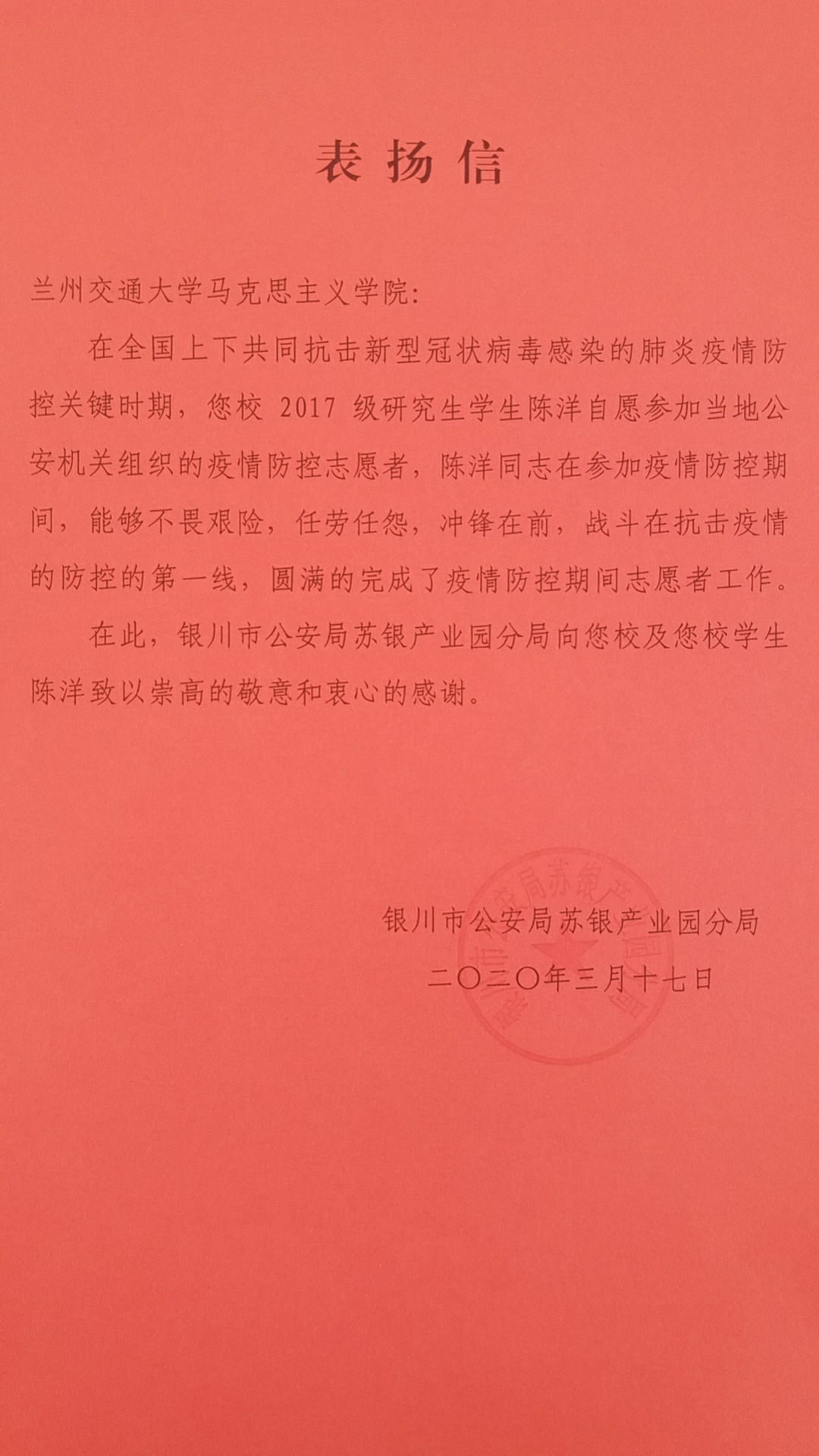 陈洋是马克思主义学院2017级的研究生党员,家住银川市兴庆区。2020年2月5日晚上,当她看到社区招募党员志愿者,参加在银居住人员入户排查和信息登记工作通知的时候,不仅自己报了名还劝说妹妹报了名。陈洋所在的小区,有一位有武汉接触史的居民,她坦言“在入户的第一天有过害怕、恐慌、担忧”,但她最终还是克服恐惧,圆满完成了各项工作任务。在参加志愿者工作的15天里,她逐户排查,承包完成了所在小区200多户的居民的信息统计和返银人员信息登记工作。当地疫情防控组织部门特地发来表扬信,对她的工作表示认可和赞赏。