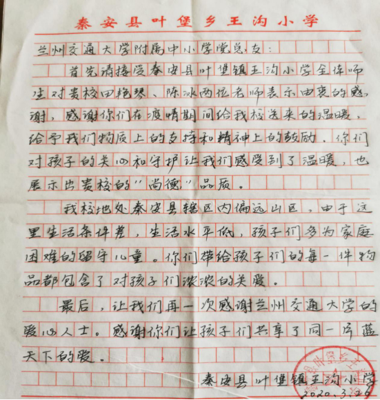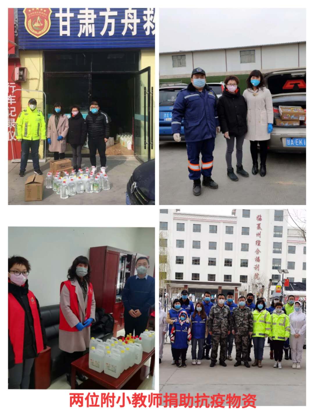 在抗击疫情期间,附小党员不但能立足岗位,做好学生的学习指导工作,而且能积极参加志愿活动并为社区和救援中心捐赠物资,主动承担社会责任。自疫情发生后,陈冰、田艳琴两位老师自愿在交大社区、甘肃蓝天救援中心从事“抗疫”志愿工作,陈冰因为超长时间参加一线“抗疫”工作,被甘肃蓝天救援中心授予“优秀队员”荣誉称号。两位老师将一月份和二月份的工资全部用来支持“抗疫”公益工作。她们一起多次为交大社区、兰飞小区、甘肃方舟救援中心筹集捐赠酒精、口罩和一次性医用手套等紧缺物品,为抗疫社区志愿者捐助方便面酸奶等生活用品。从微信朋友圈获悉秦安县山区叶堡镇王沟小学开学之际,急缺“防疫”物资,两位老师给学校每一位孩子购买、捐赠了口罩、酒精、运动服、毛衣。中考在即,临夏福利院的孩子急需英语辅导老师,求助社会,两位老师积极和外语学院老师取得联系,对福利院的孩子进行线上辅导,同时还和甘肃蓝天救援队一起捐钱捐书,为临夏福利院的孩子解决燃眉之急。