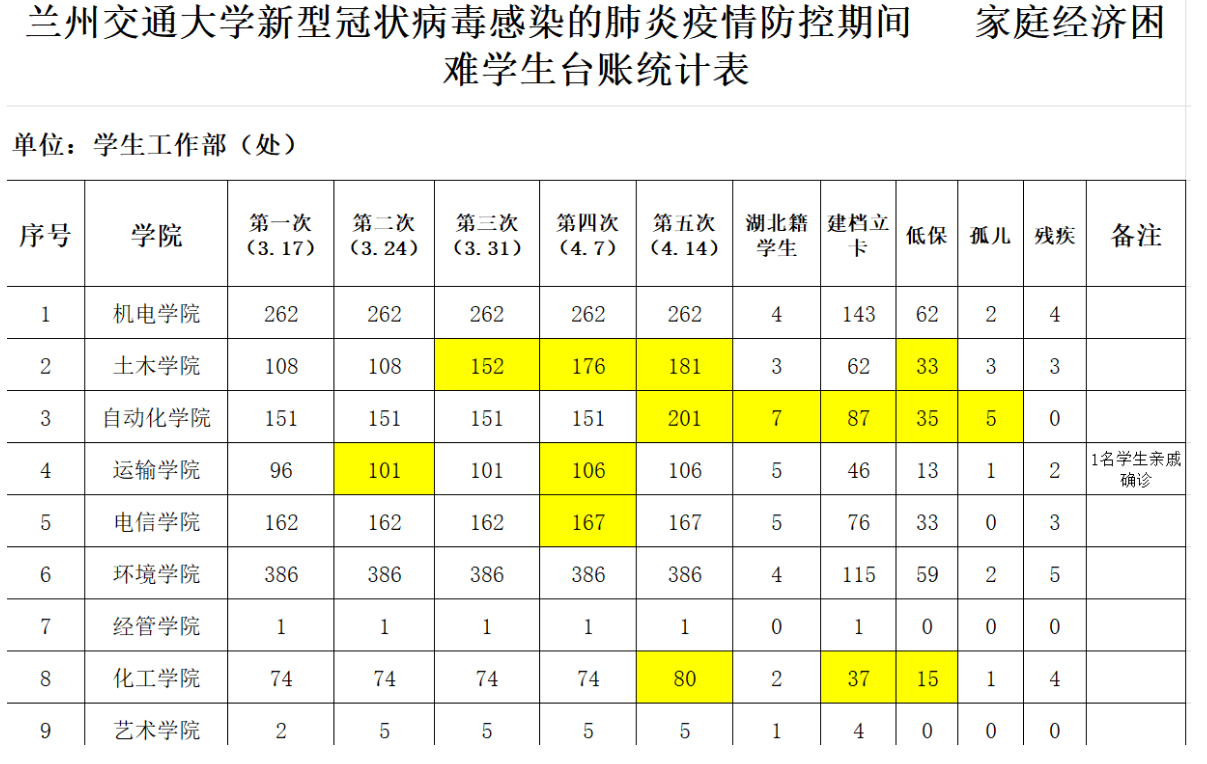 为密切关注疫情防控期间家庭经济困难学生的实际情况,及时了解受疫情影响的学生身体和生活情况,要求各学院(部)要采取有效措施,组织辅导员、班主任系统排查受疫情影响的家庭经济困难学生并逐一登记。截止4月14日根据我校各学院(部)排查,共计2059人,其中建档立卡户和低保户1234人,孤儿和残疾人数49人,湖北籍家庭经济困难学生54人。在排查中切实做到了对感染新冠病毒学生、疑似感染学生、家庭直系亲属感染学生、隔离观察学生、受到疫情影响主要劳动能力不能外出或延迟外出打工的家庭经济困难学生情况的精准掌握。