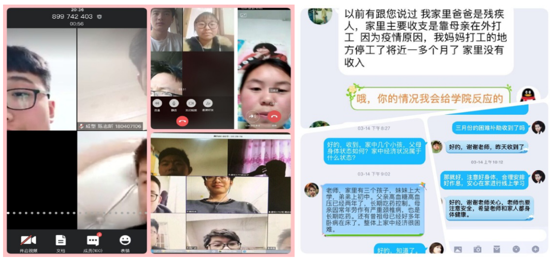 学校充分运用“互联网+资助”的工作形式,由各学院(部)辅导员、班主任通过网络视频、网络电话等方式与我校家庭经济困难学生及家长进行网络慰问,了解其生活情况并鼓励学生安心学习,做好防疫,有困难及时和学校沟通。