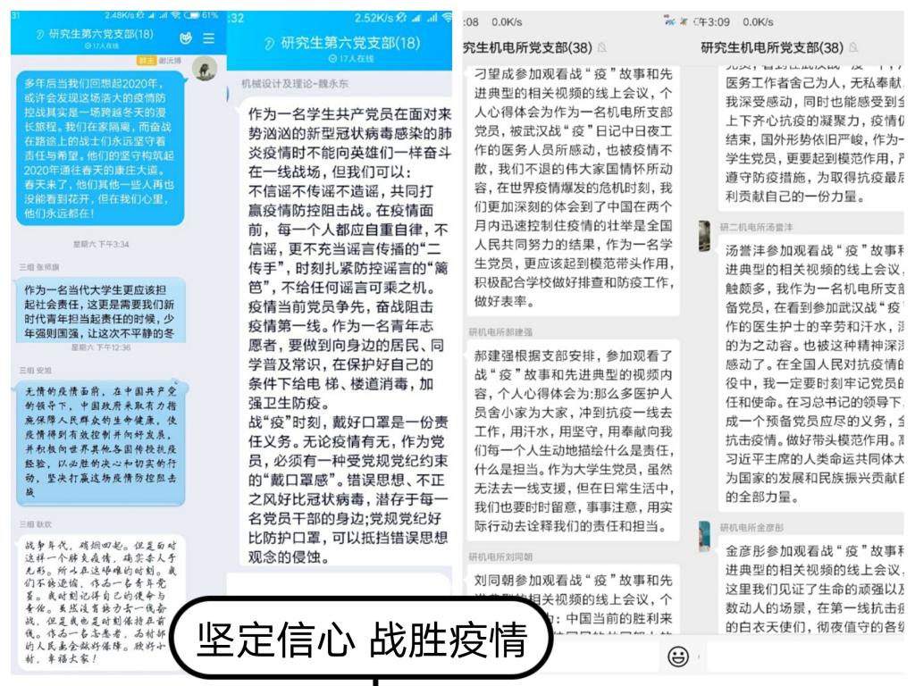 研究生机电所党支部和研究生第六党支部以“疫情我要说”为主题,从大学生党员的视角出发,畅谈了对疫情防控的深刻认识,表达了对祖国取得抗疫全面胜利的坚定信心。