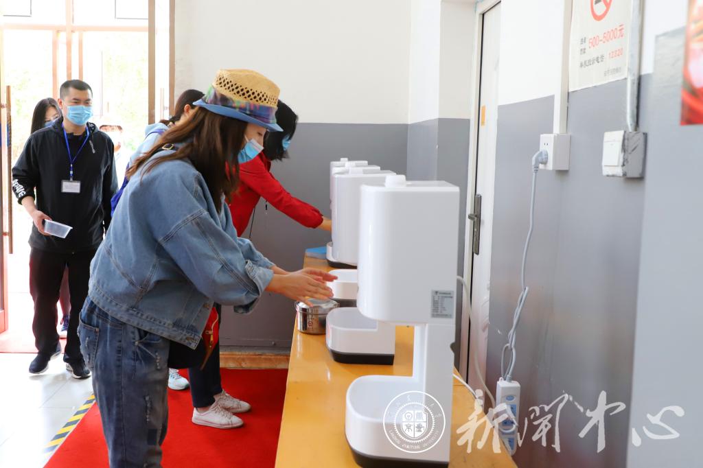 学生检测合格后,按指定路线到达钟楼广场报道。每个学院报到点均设置出入口专用通道并设有醒目标识,配备酒精、感应式消毒器、体温计等防疫物资,辅导员再次核实学生信息后,发放健康手册和校园健康通行证,完成报到注册。
