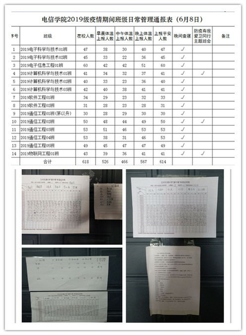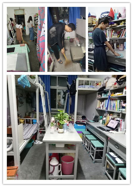 电信学院以腾讯课堂、陇政钉为媒介,以班级为单位,召开了“防疫有我,爱卫同行”宿舍卫生大扫除主题班会,积极发动班干部、宿舍舍长、党员三大骨干力量成立爱卫同行行动小组,组织开展全员、全方位宿舍大扫除活动,通过在宿舍张贴《体温检测晨午晚报告表》、《宿舍公约》、《宿舍值日表》的方式对学生进行督促提醒,切实做到疫情防控期间保证每日固定时间开窗通风、及时清理宿舍堆积垃圾,定期完成宿舍消毒等工作。6月3日至9日,全院共计500余间宿舍参与了此次活动。