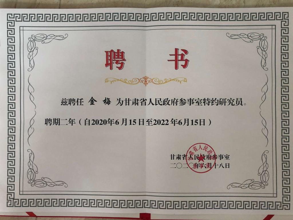 6月30日,在甘肃省社会主义学院召开的《甘肃省人民政府参事工作会议》中,我校金梅教授被聘为省政府参事室特约研究员,任期两年。