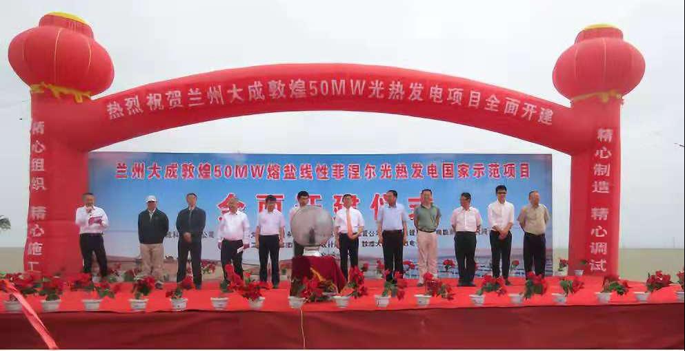 兰州大成敦煌5万千瓦熔盐线性菲涅尔式光热发电示范项目于2016年9月成功入选国家首批光热发电示范项目,项目位于敦煌市光电产业园区,总投资16.8亿元。项目采用兰州大成公司具有自主知识产权的线性菲涅耳式太阳能聚光集热系统技术和熔盐高温集热、传热、储热和换热技术,建设规模为50MW的换热、储热、发电等相关配套设施,正常天气具备24小时发电能力。